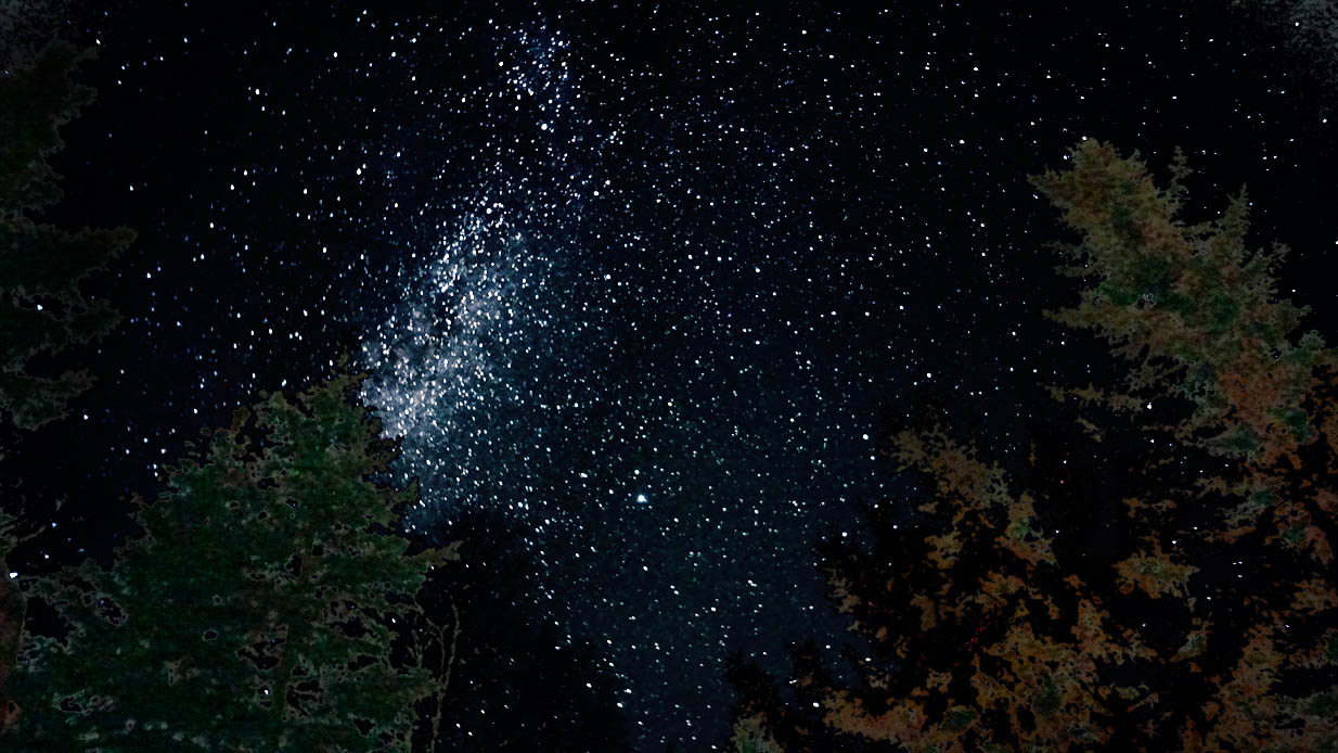 While I was in Photoshop I decided to experiment with adding some context to the image other than trees. So I took a night shot of my cabin from the lake, went into Photoshop and replaced the sky in the cabin shot with my photoshopped fixed Milky Way image.